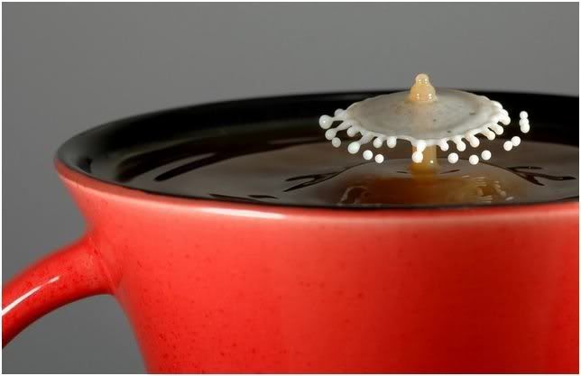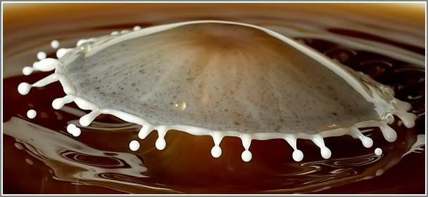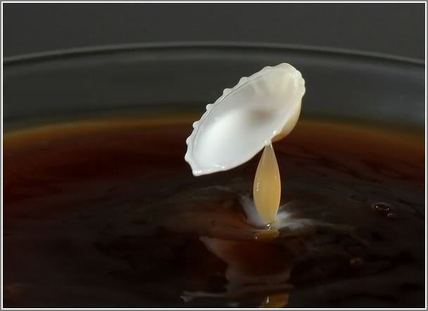 Stop-motion photography of what happens when a drop of milk falls into a cup of coffee. So cool huh ?. Be3te2id enno bienfosil l water bel milk, 3an l MILK b7ad zeto, w hek bisir..